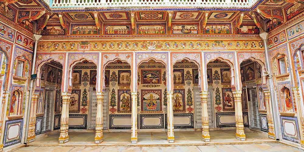 Rejoignez le Shekhawati, surnommé la galerie d’art à ciel ouvert. Admirez les havelis aux fresques colorées. Initiez-vous à l’Hindi en chemin. Arrivée à Alsisar et installation à l’hôtel. Assistez à une démonstration culinaire. Dîner logement.