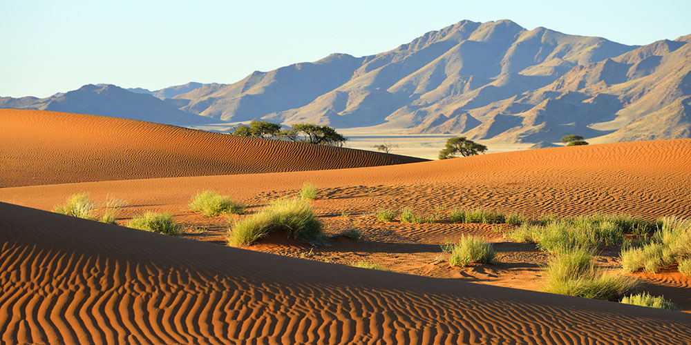 Les premières heures de la journée sont parfaites pour profiter des hautes dunes du Namib. L'ascension de l'une d'elles vous offre une vue panoramique sur la mer aux reflets orangés. Vos véhicules à toit ouvrant se lancent sur des pistes de sable pour rejoindre Vlei. Vous apercevrez peut-être des oryx et des springboks en chemin. Promenade romantique dans le désert au coucher du soleil. Deuxième nuit au lodge. Dîner logement.