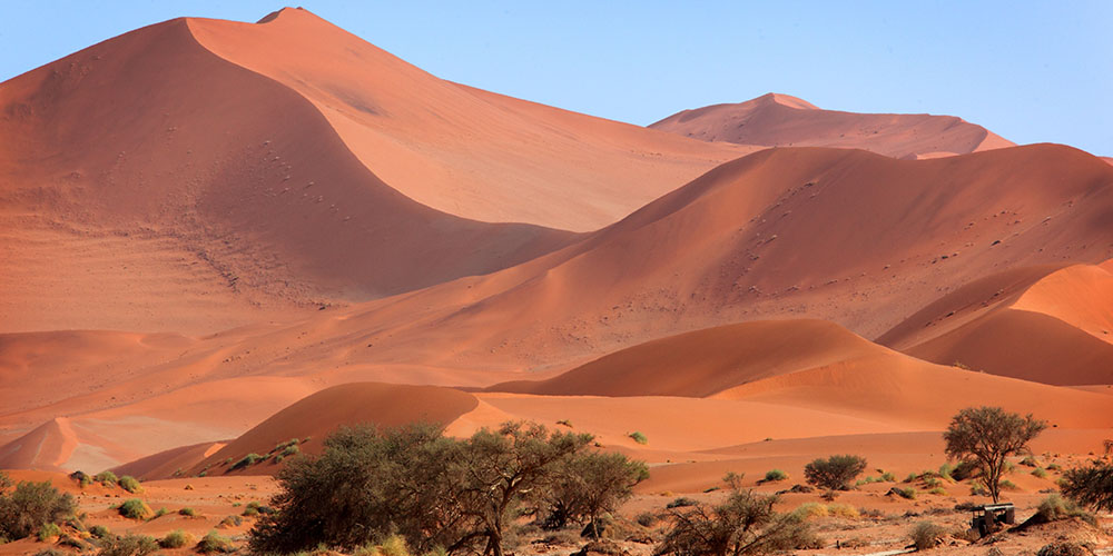 Les premières heures de la journée sont parfaites pour profiter des hautes dunes du Namib. L'ascension de l'une d'elles vous offre une vue panoramique sur la mer aux reflets orangés. Vos véhicules à toit ouvrant se lancent sur des pistes de sable pour rejoindre Vlei. Vous apercevrez peut-être des oryx et des springboks en chemin. Promenade romantique dans le désert au coucher du soleil. Deuxième nuit au lodge. Dîner logement.