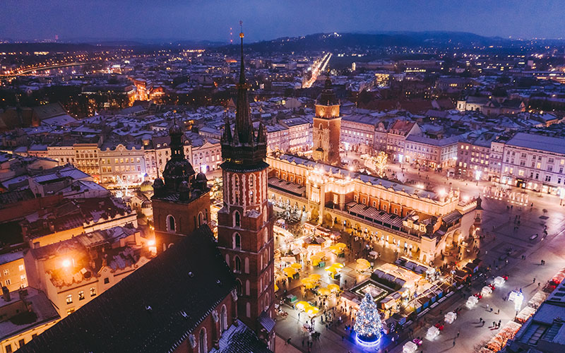 Rendez-vous à l’aéroport de Lyon St Exupéry. Assistance aux formalités d’enregistrement et embarquement à destination de Cracovie. Vol avec escale. Accueil puis transfert dans le centre et installation à l’hôtel. Partez pour une petite promenade dans la vieille ville illuminée pour retrouver l’ambiance de Noël. Dîner. Logement.