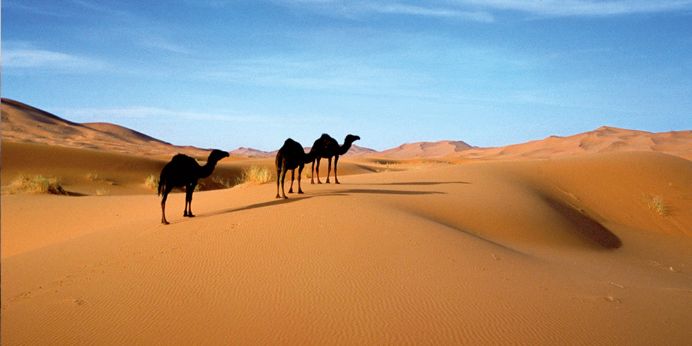 Continuation vers le sud-est du pays, les paysages deviennent de plus en plus désertiques et forment un contraste très remarquable avec les oasis verdoyantes et les Ksour construits en terre. Vous arriverez dans la vallée de Ziz, célèbre par sa production et son festival des dattes. Vous traversez Erfoud où vous visiterez le plus grand Ksar du sud marocain. Vous poursuivrez vers Rissani, le berceau de la dynastie actuelle avec le beau mausolée de Moulay Ali Cherif. A la sortie des palmiers, vous apercevez les hautes dunes roses de Merzouga à l’horizon d’un vaste plateau désertique sombre. Installation à l’hôtel. Dîner logement.